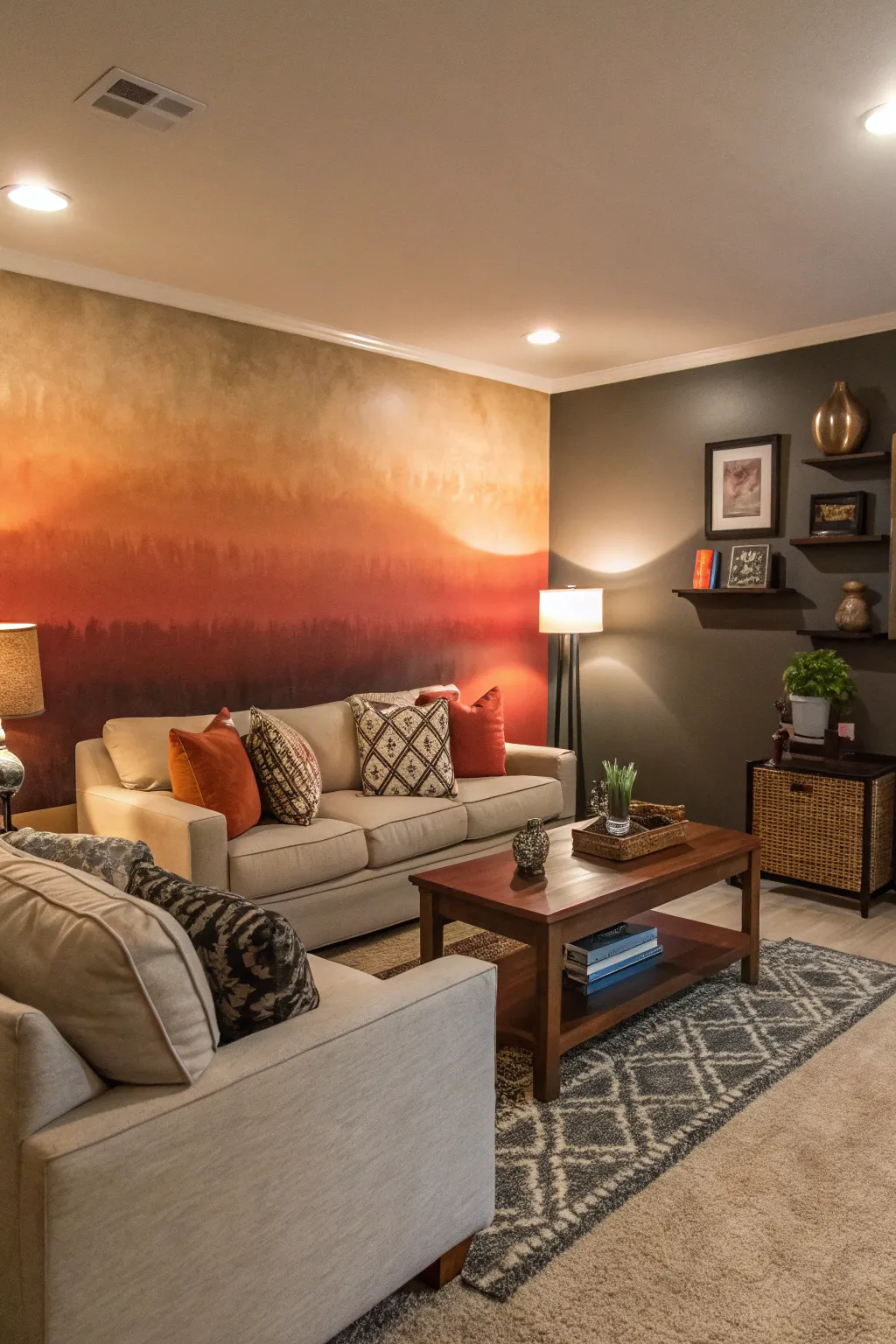 Experiment with panel shading for a modern aesthetic. I merged bold sections of color in my family room to craft a dynamic and contemporary vibe.