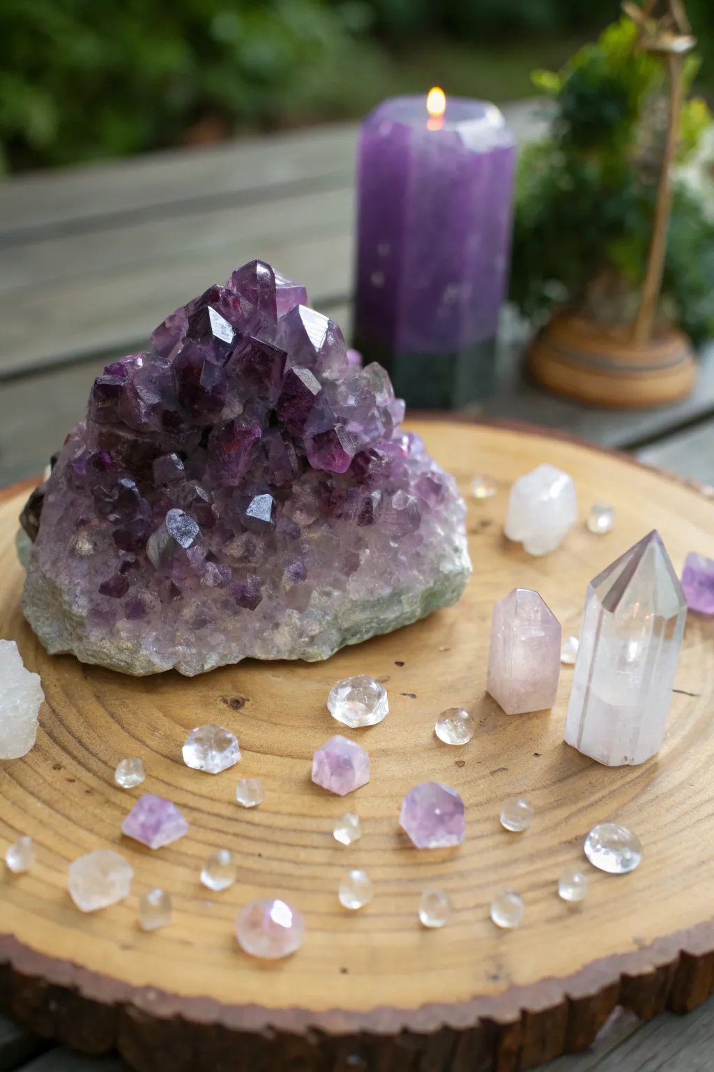 Begin with a quintessential gemstone collection as your focal piece. I’m particularly drawn to sizable amethyst or clear quartz for their serene vibe and striking visual appeal.