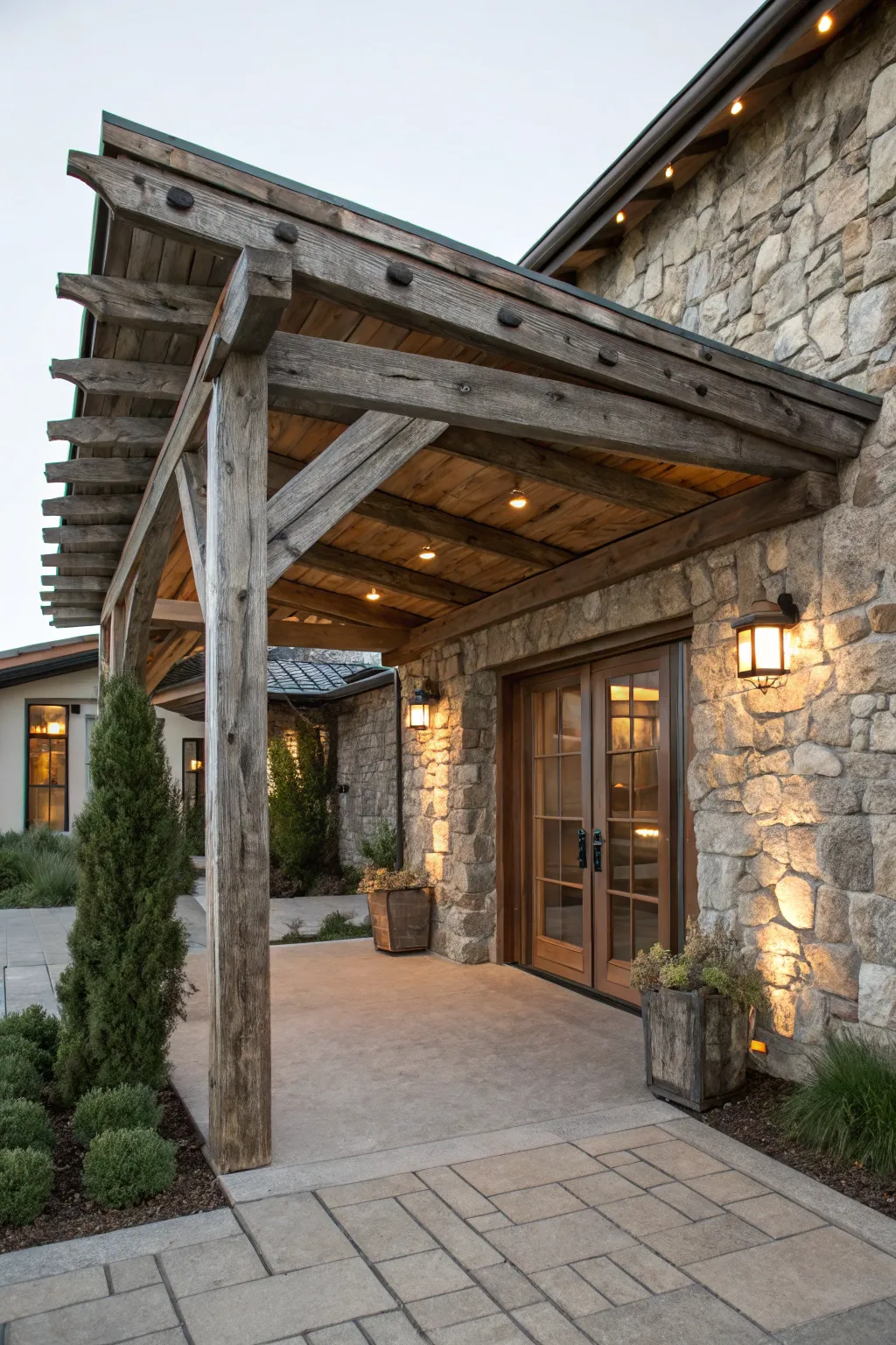 A lumber canopy can present an endearing charm that exudes warmth and welcome. I’ve made use of salvaged lumber for an environmentally conscious variation that upholds a welcoming vibe.