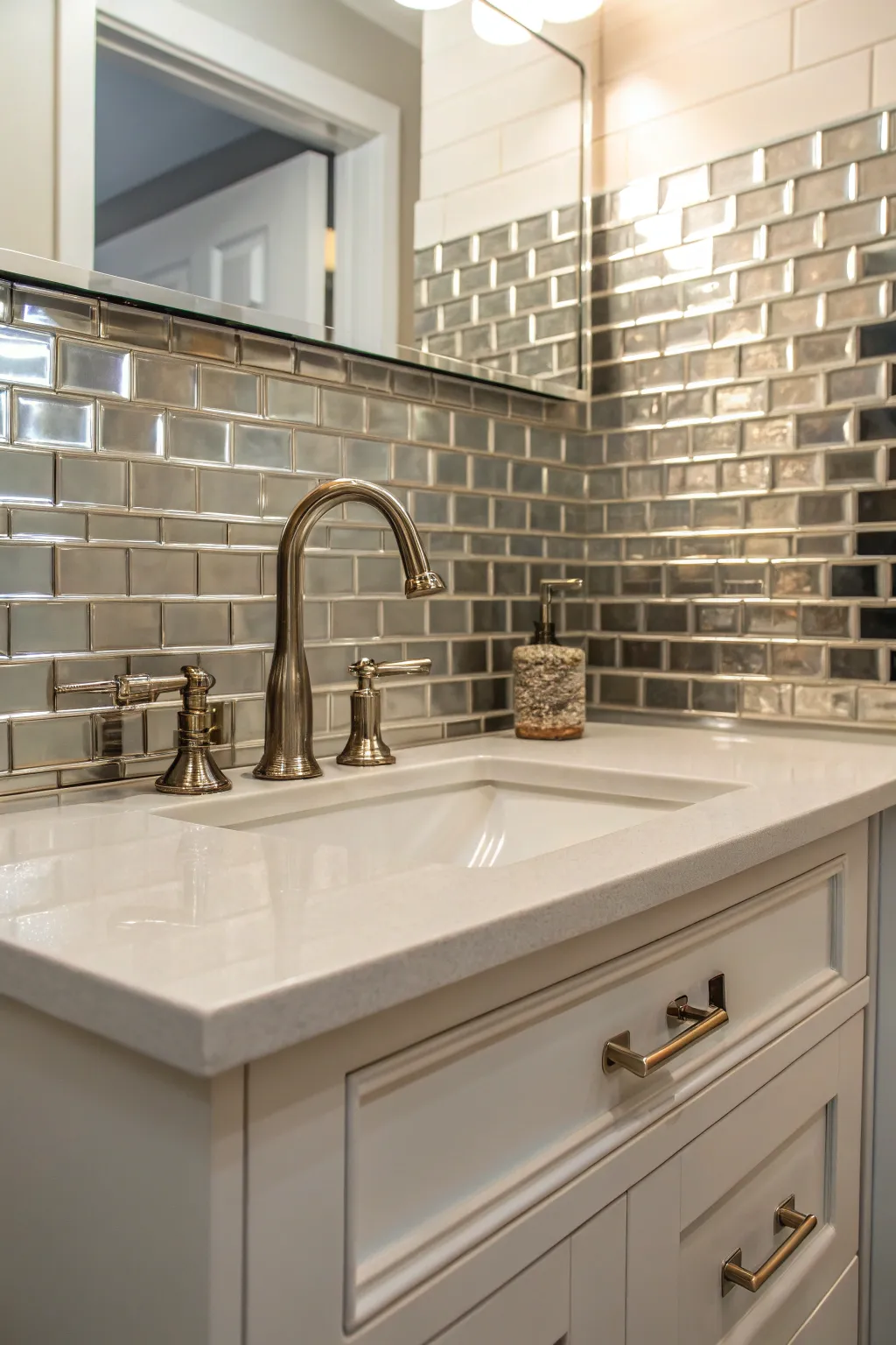 Introduce some glimmer with shimmering tiles for a hint of glamour. I’m drawn to how they reflect light, adding a luxurious allure to any bathroom.