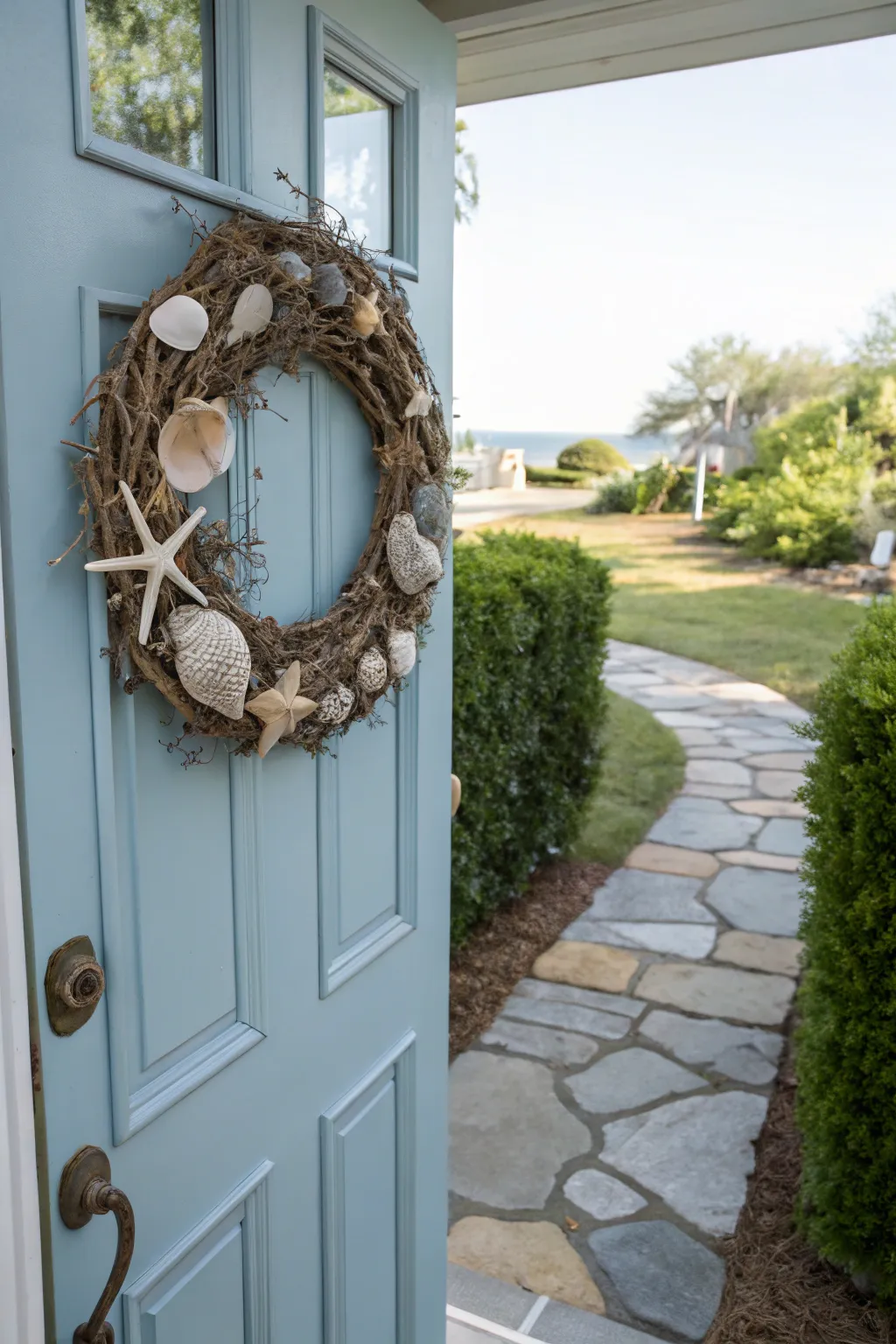 Greet guests with a seashell garland on your entrance door. This captivating technique introduces a hint of the coast to your home’s entryway.