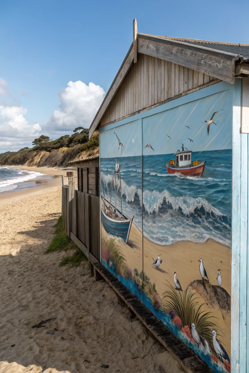 Illustrate a coastal wall art on one wall to add an artistic aspect. I partnered with a local artist, and now my shed portrays a narrative of the sea.
