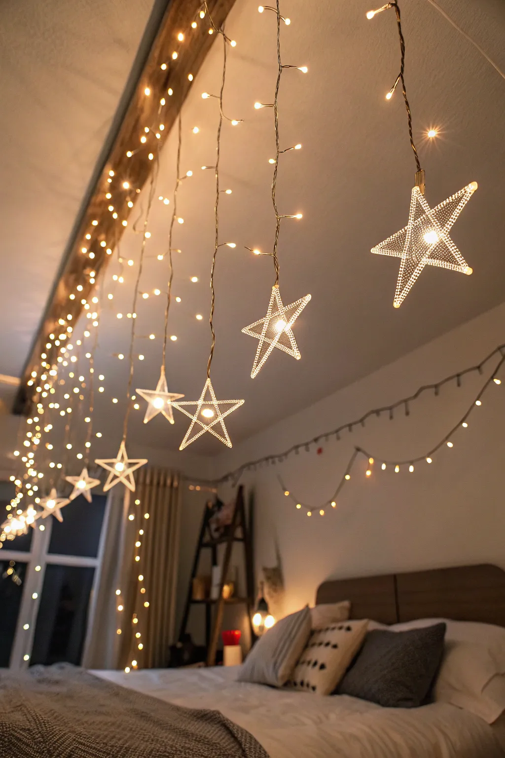 Suspend sparkle lights like a curtain behind your bed or along a wall for a magical backdrop. This concept brings an ethereal quality to your room.