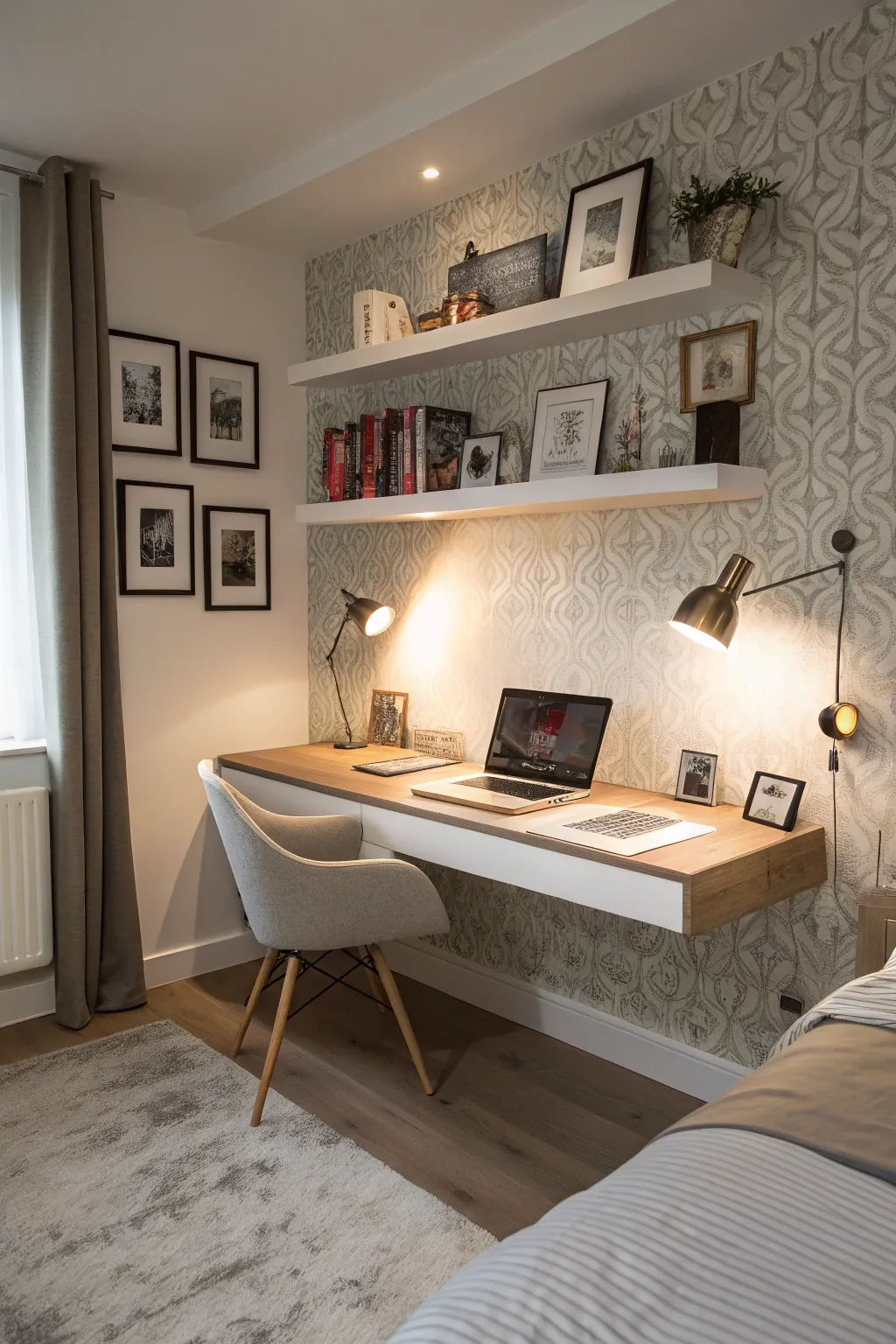 A wall-mounted desk can serve as a refined solution for incorporating workspace without congesting the room. I’ve set these up in numerous designs, and they excel in effective space utilization.