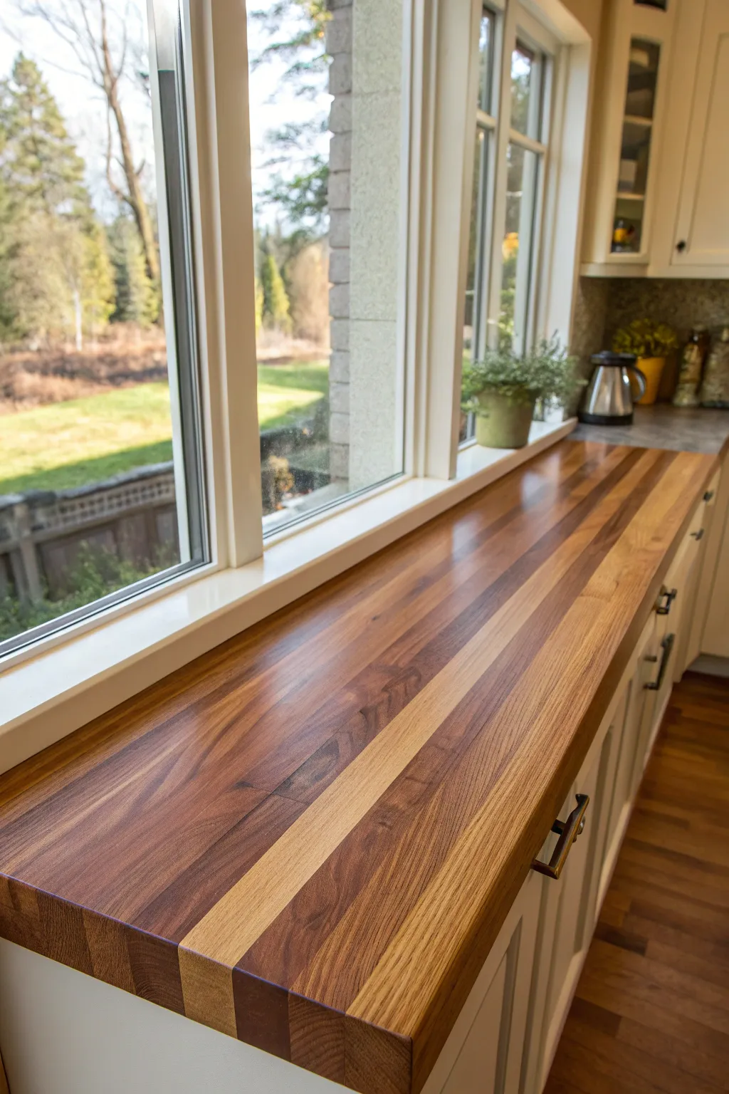 Swap out standard window ledges with butcher block for an added layer of inherent beauty. I believe the wood grain truly enriches the outside view.
