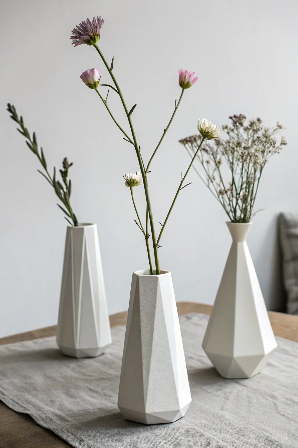 - Snowy Geometric Flower Vessels: Embrace simplicity with these snowy geometric flower vessels, tailored for individual stem arrangements.