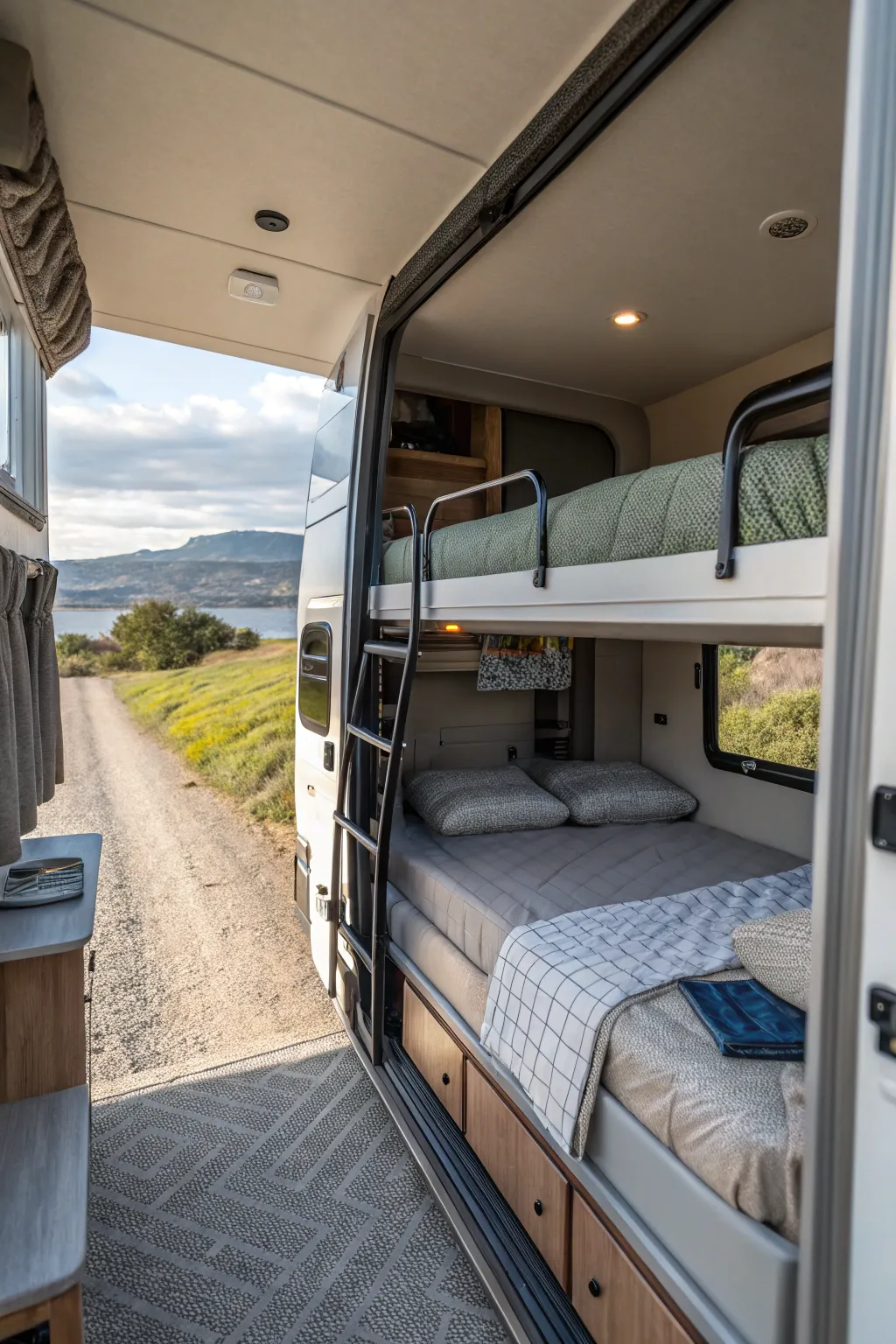 One strategy I greatly value is leveraging bunk beds to capitalize on vertical space. Besides conserving space, they introduce a playful element to your RV’s bunkhouse.