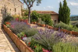 Adding country-style wooden pieces such as benches or containers gives a natural feel. I made some using recovered lumber, and they complement the surrounding nature beautifully.