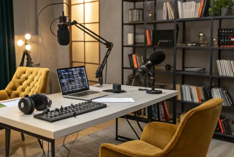 Creating a podcast area is similar to designing a backdrop for your stories. Let’s explore inventive ideas that will transform your recording space into something visually stunning. Simple Refinement An uncluttered podcast studio arrangement. A simple layout emphasizes the discussion. I frequently suggest utilizing sharp edges and muted shades to foster a peaceful and distraction-reduced atmosphere. Possibly helpful picks: Small White Worktable: Revamp your podcast arrangement using a streamlined, simple white worktable, ideal for concentration…