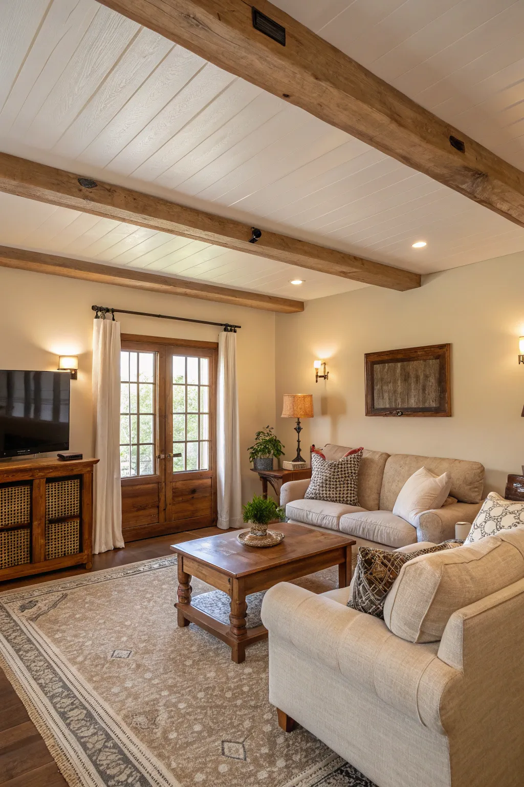 - Ornamental Ceiling Supports: Infuse countryside charisma into your space with ornamental timber supports complementing painted plank paneling ceilings.