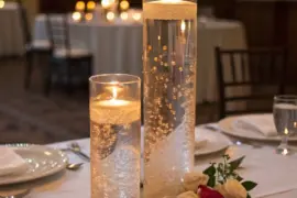 I’m a big fan of using floating candles in clear, tall vases filled with water. If you toss in a few flower petals or pebbles at the bottom, you’ll have an elegant, yet simple centerpiece.