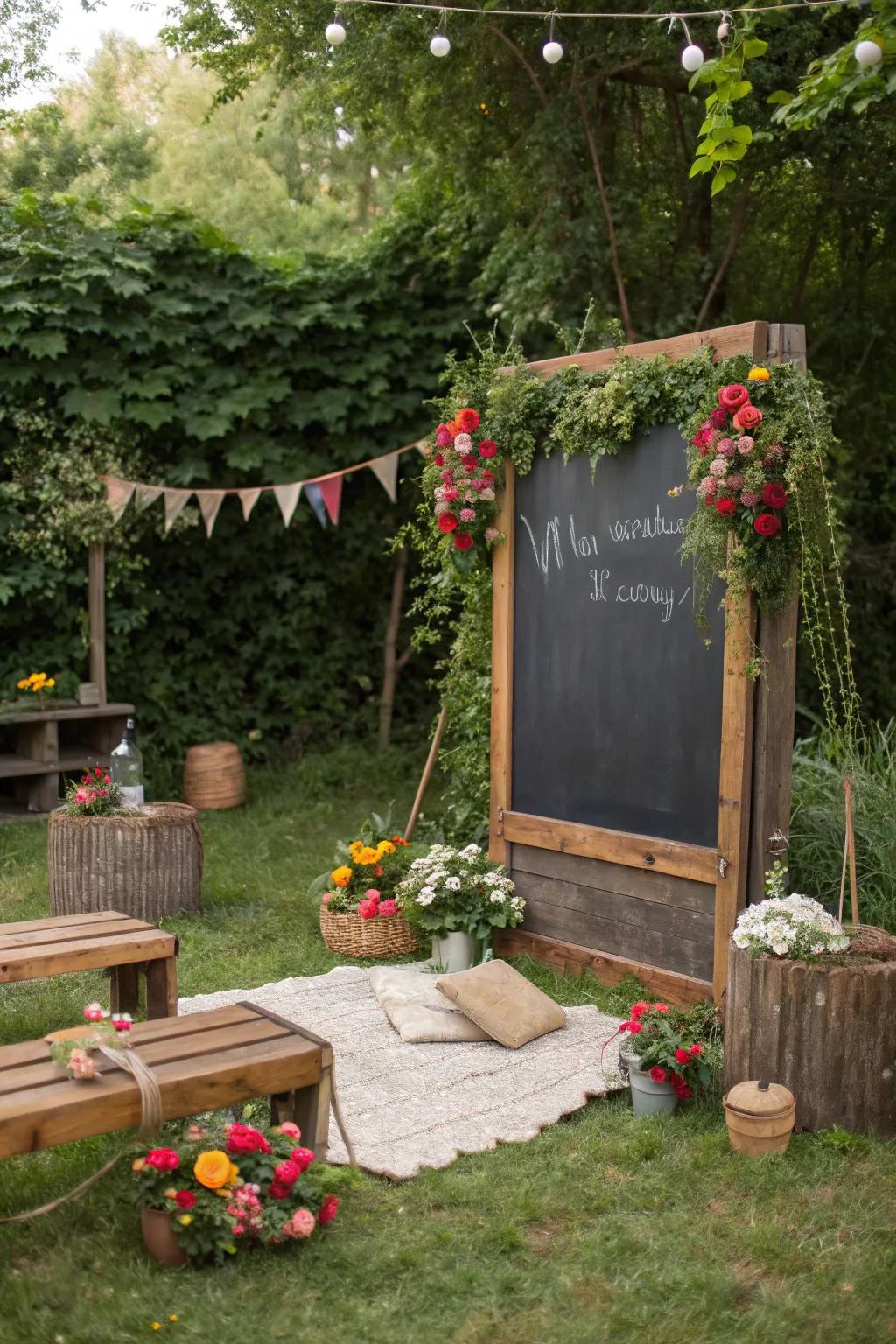 Create a playful picture area using a chalkboard background for a DIY photo booth. It’s a fun means for capturing memories alongside friends and relatives.