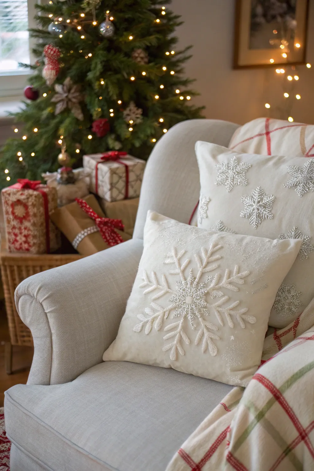 Motif cushions provide a vibrant blend of patterns and hues. I enjoy incorporating crimson and verdant shades for a conventional Christmas ambiance.