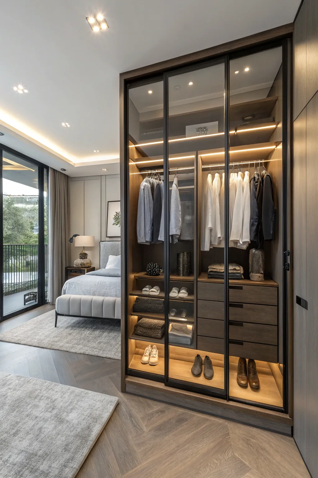 Convert your closet into a display area with glass doors. This concept transforms your wardrobe into a curated assortment, one of my most preferred ways to introduce sophistication.