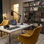 Design a radiant art workspace featuring expansive windows and spacious environments. This setup is ideal for sparking creativity and providing a dedicated workspace.