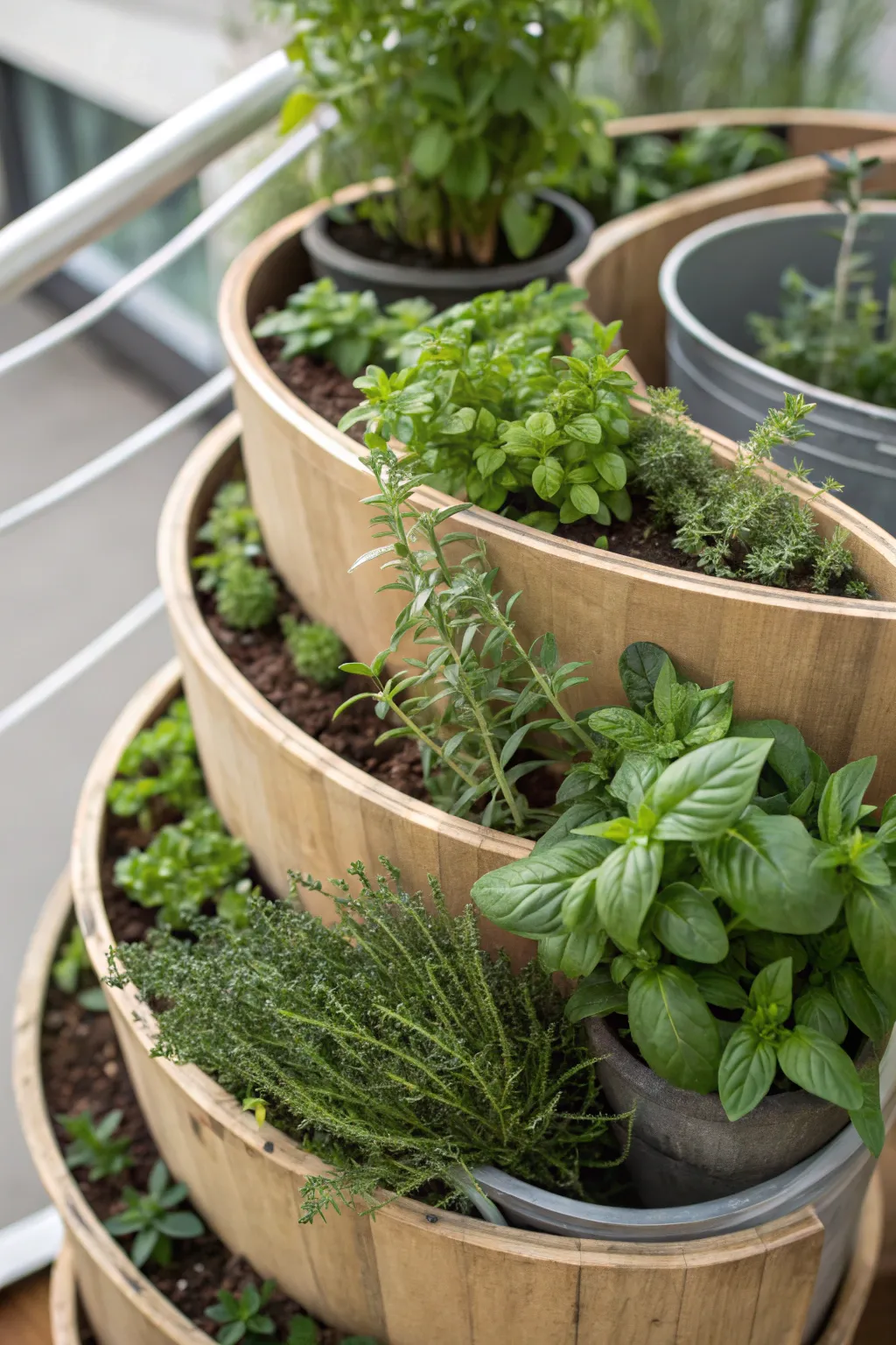 Construct a stacked container spiral for herbs, optimizing space and crafting a scented cascade.
