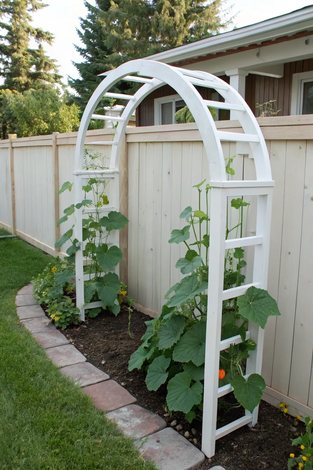If you have a garden fence, why not allow your cucumbers to climb on it? A boundary wall trellis is effective and makes use of existing structures.