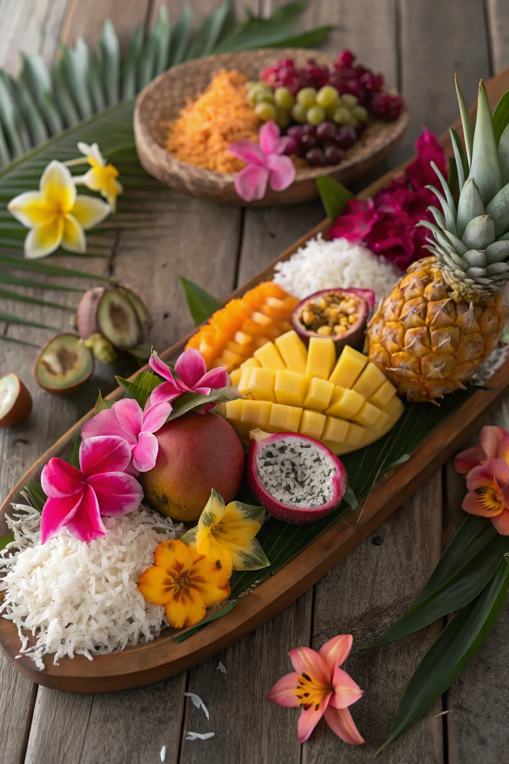 Add some island themes with a tropical theme, with exotic fruits, coconut shavings, and flowers. It’s a nice refreshing change of pace!