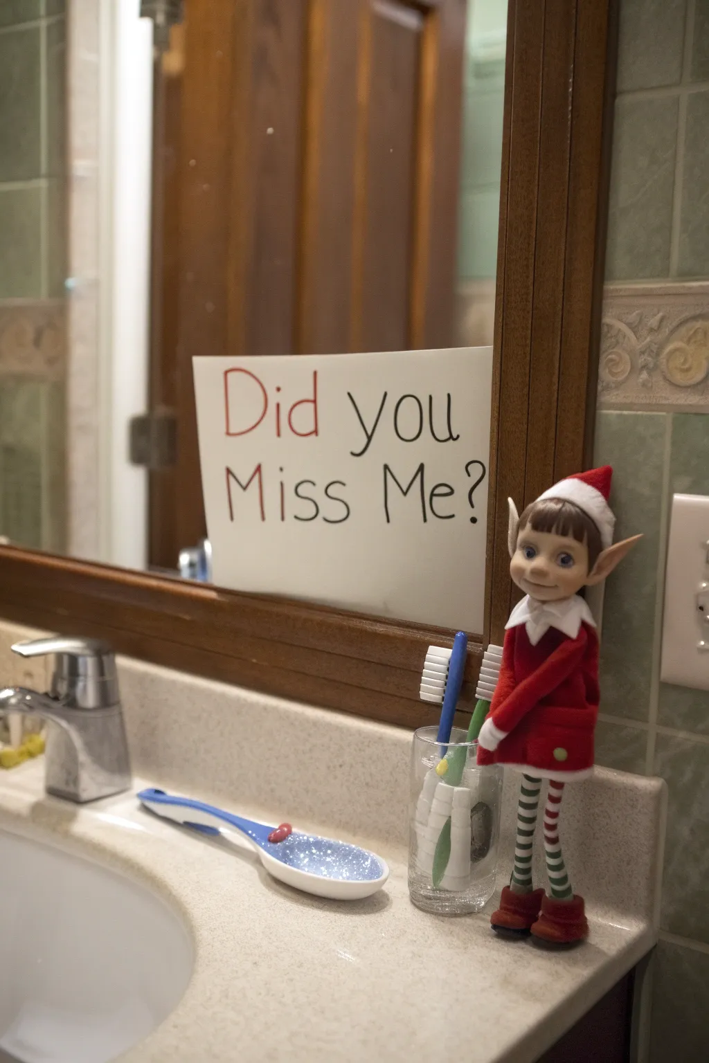 Write a funny message like ‘Did you miss me?’ on the bathroom mirror with a dry-erase pen. It’s a simple but great way to make the kids laugh first thing in the morning. I always make sure to draw the sprite waving.