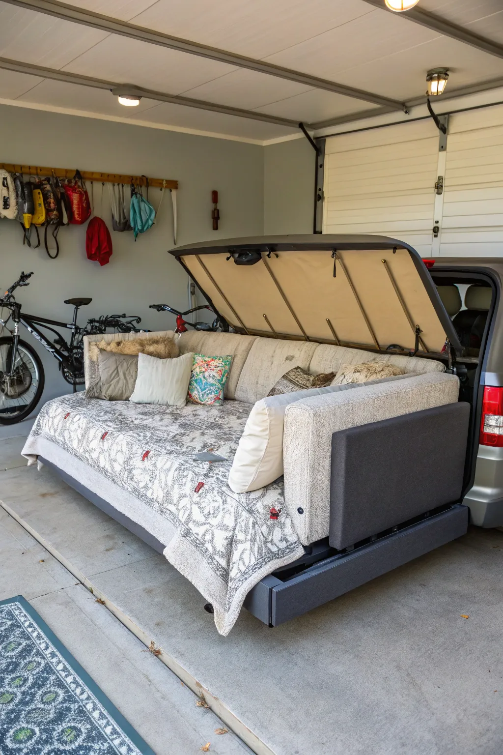- Slide-Out Sleeping Divan: Effortlessly transform your garage into a guest suite through a streamlined slide-out sleeping divan.