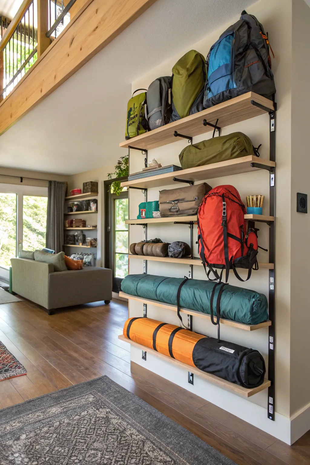 Purchase durable shelves to hold larger items like rucksacks and sleeping bags. Personally, in my garage, these shelves ensure that everything is within reach and not on the floor, which makes the space feel bigger.