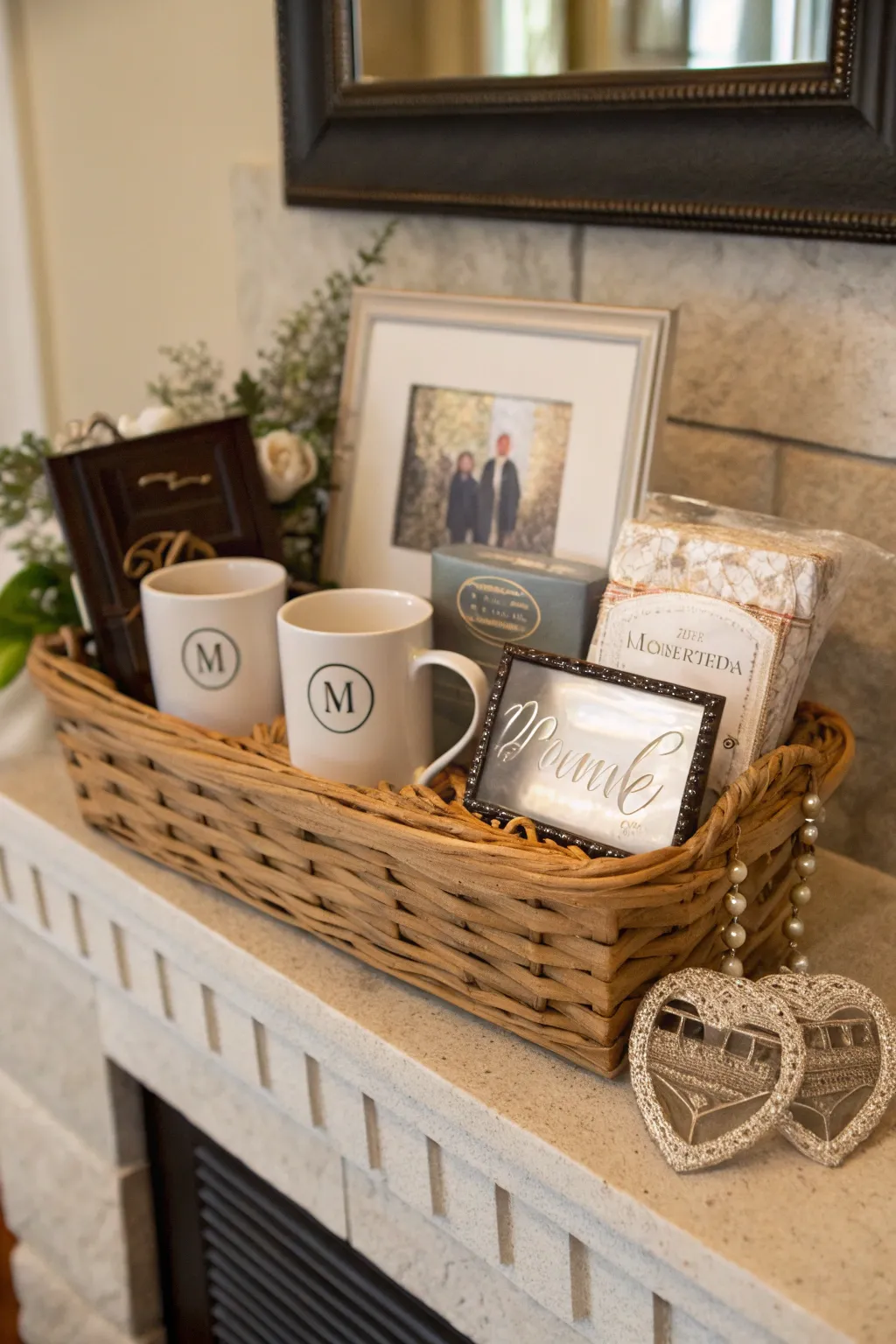 Craft a heartfelt gift with a customized basket that includes unique mugs, engraved accessories, and a picture display. Adding a handwritten message offers an extra personal feel.