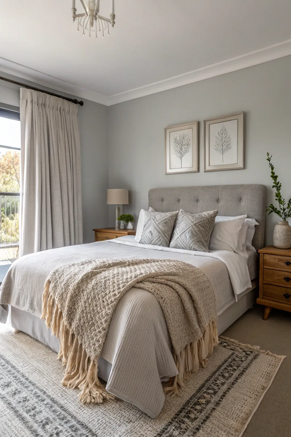 Design a peaceful retreat with light grey walls matched with neutral bedding. I enjoy incorporating textured throws and pillows to increase the sense of comfort and warmth.