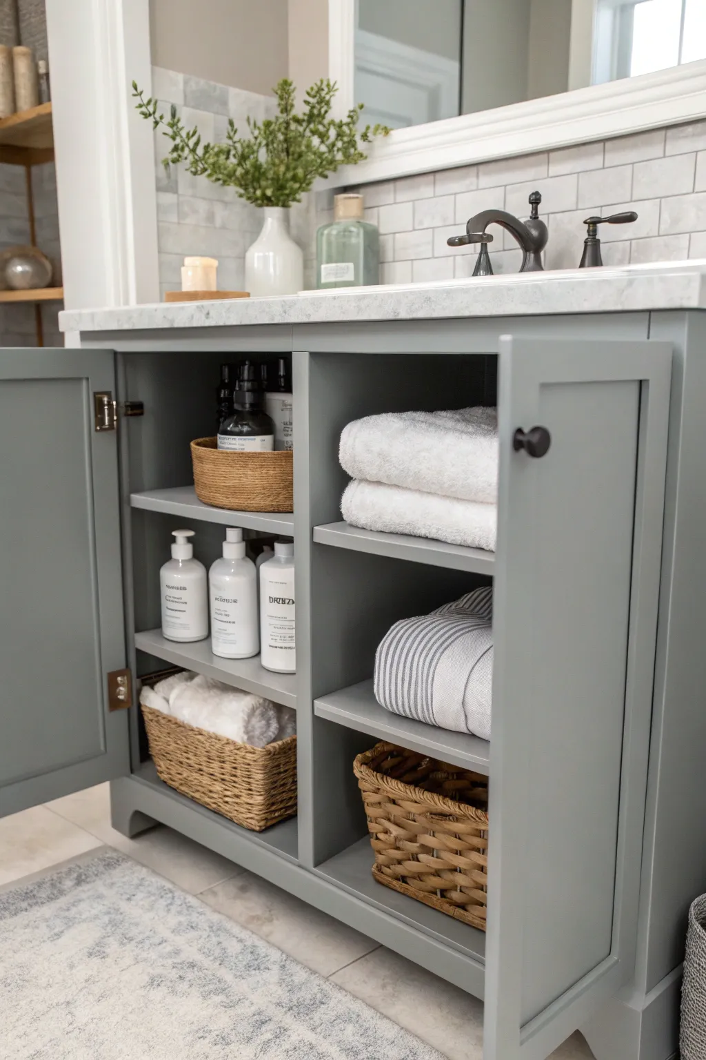 Incorporate display shelving with your gray vanity for accessible storage. It’s a functional and stylish way to display essentials.