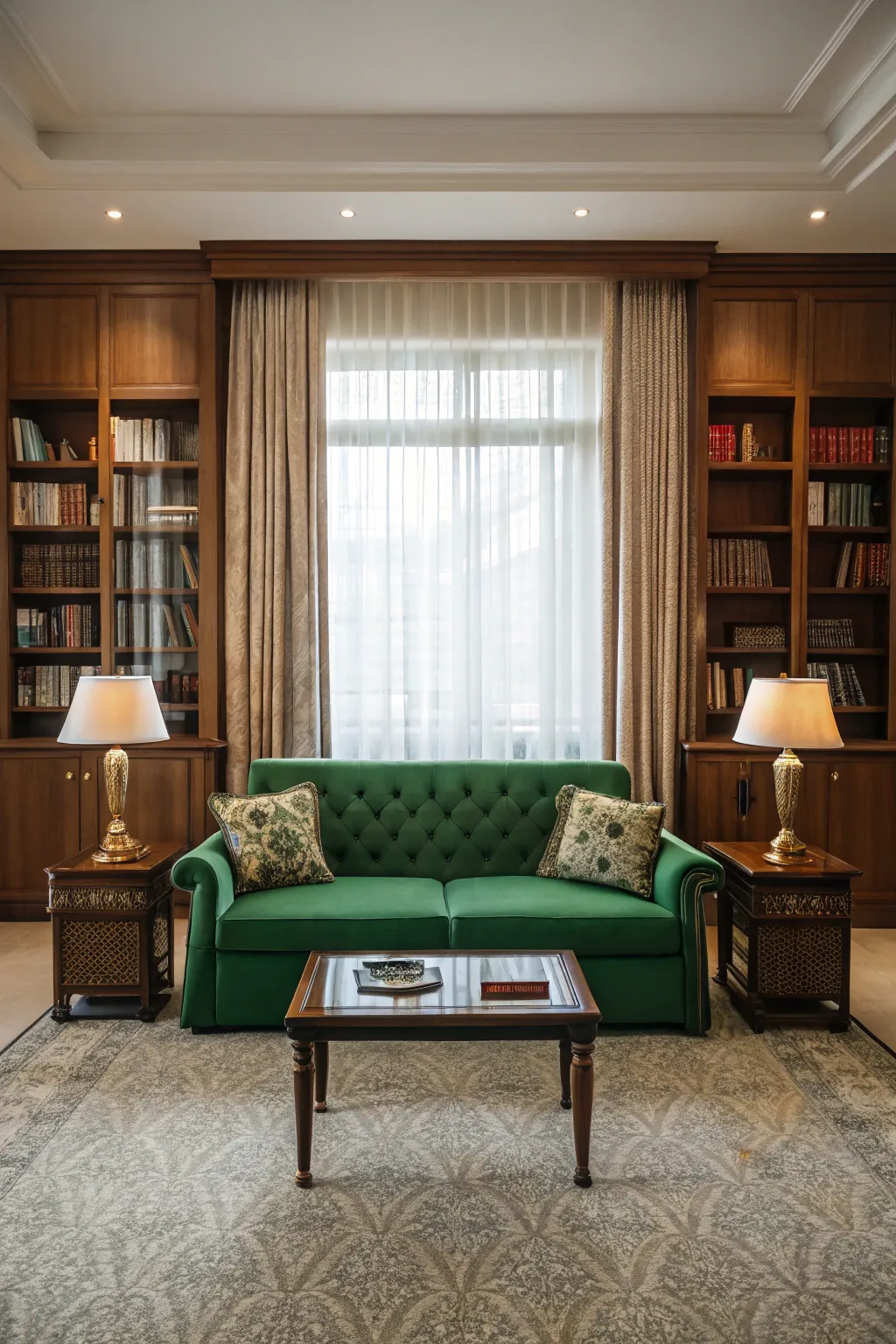 Combine contemporary furniture pieces with your classic emerald couch to create a sophisticated style that combines different eras of design. This gives your living room more depth and a timeless appeal.