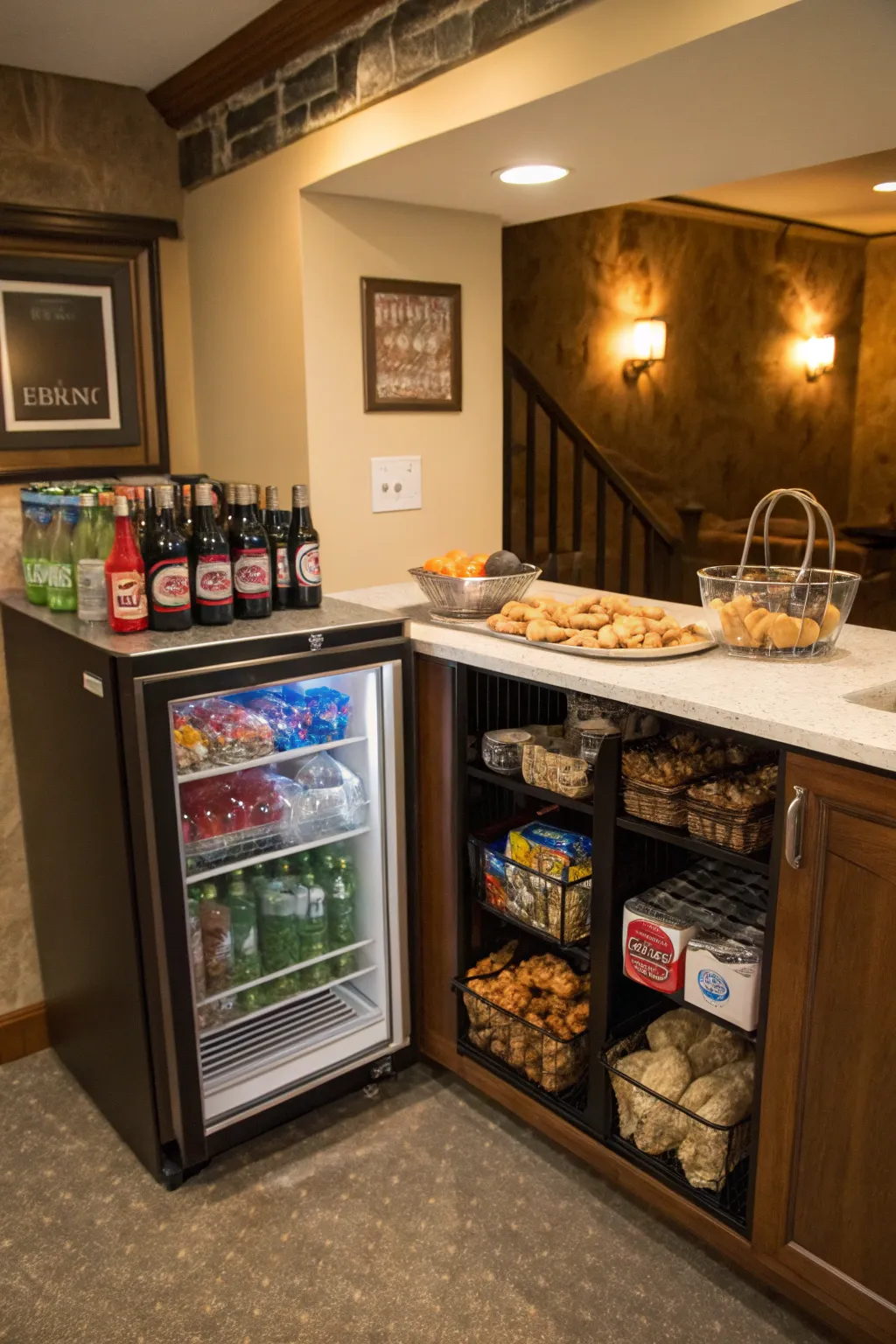 Construct a snack and beverage station offering easy access to refreshments during social events. With a small refrigerator and snack selection, enjoying treats is simple without needing to leave the basement.