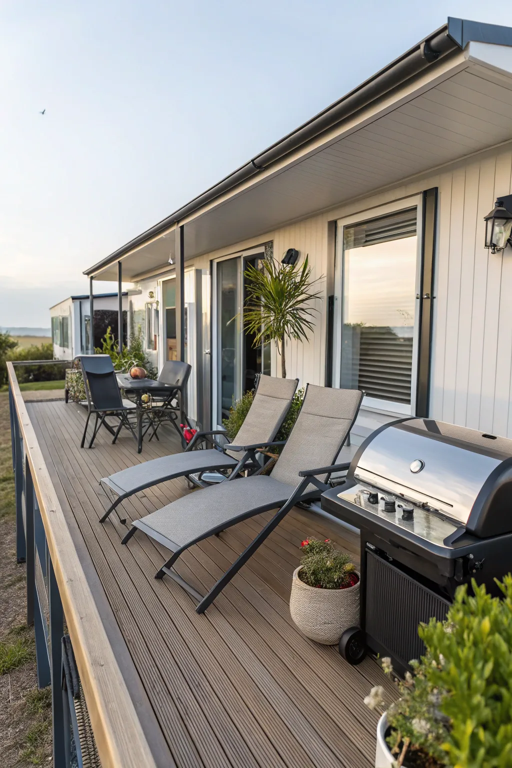 A stylish deck featuring lounge chairs and a barbecue grill, ideal for outdoor gatherings.