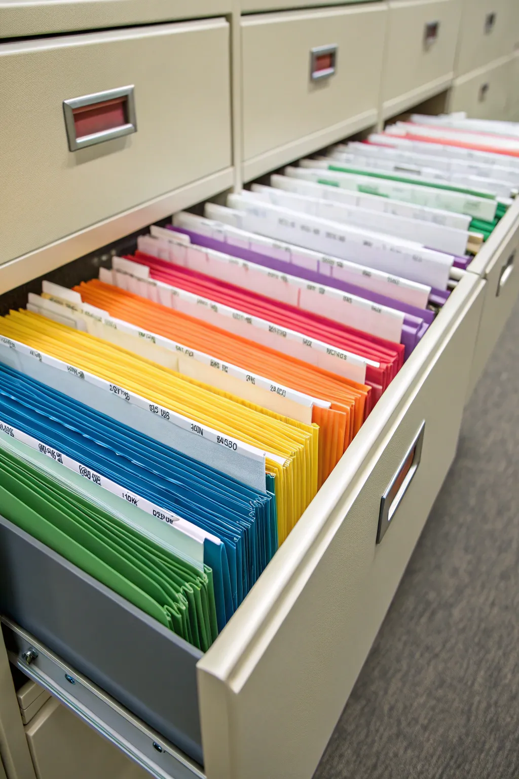 Implementing a color-coded filing system can dramatically improve organization, enabling quick identification of categories. I adore using bright colors to revitalize my filing cabinet, turning it into a functional and visually delightful piece.