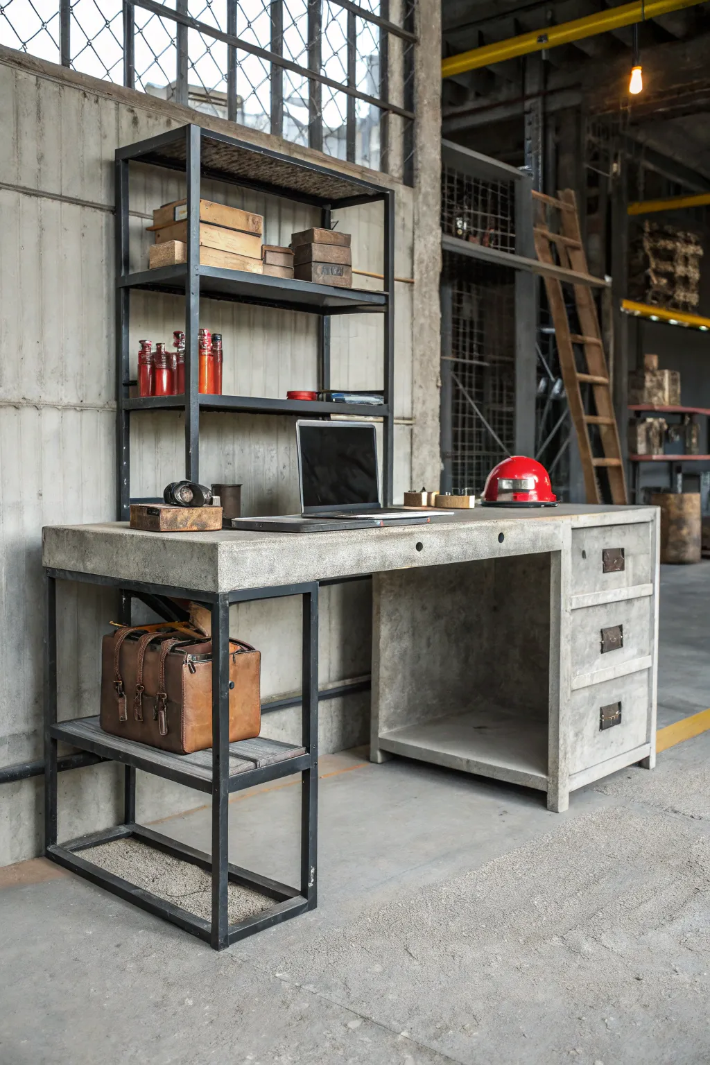 A bold, enduring industrial desk created with concrete and steel.