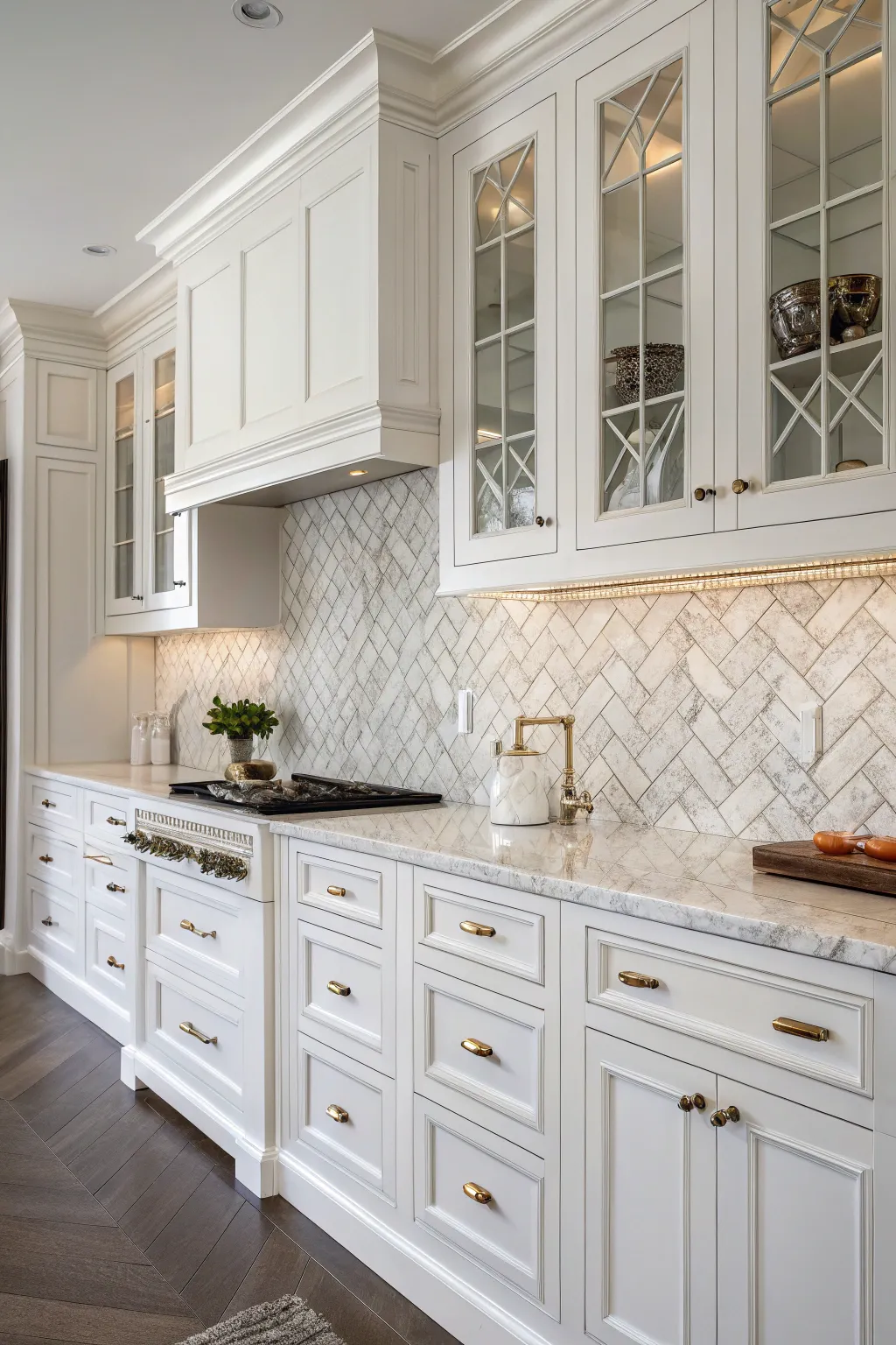 A marble herringbone backsplash introduces a hint of sophistication and tactile interest alongside white cabinetry. The distinctive V-shaped arrangement naturally captures attention, accentuating the marble’s inherent striations with grace.