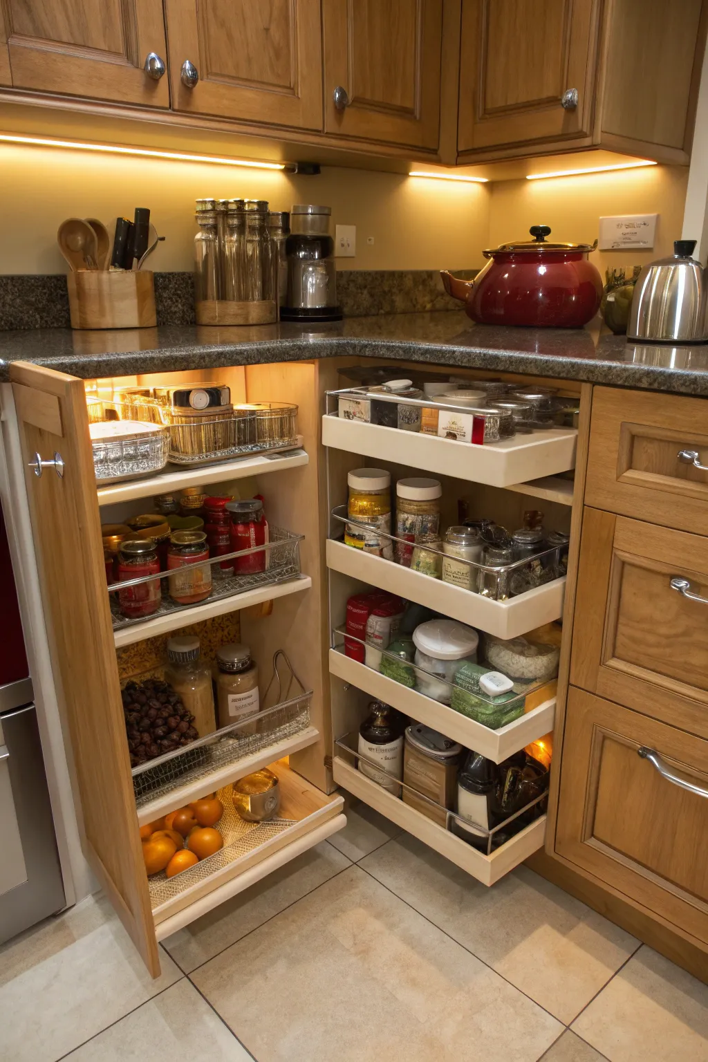 Clever corner units bring hidden storage to the forefront with sliding and pivoting shelves. They’re a dream come true for those looking to maximize every inch.