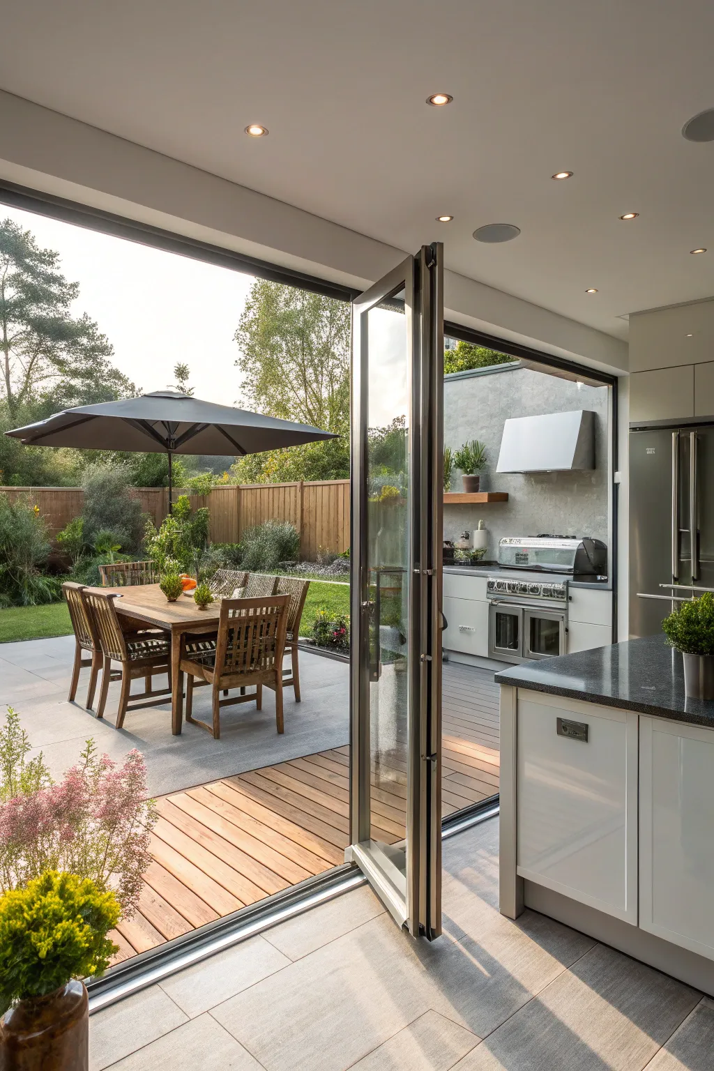 Utilizing large glass doors or windows to integrate interior and exterior zones enhances the openness of your kitchen. I am particularly fond of this strategy, as it establishes a smooth connection to nature.