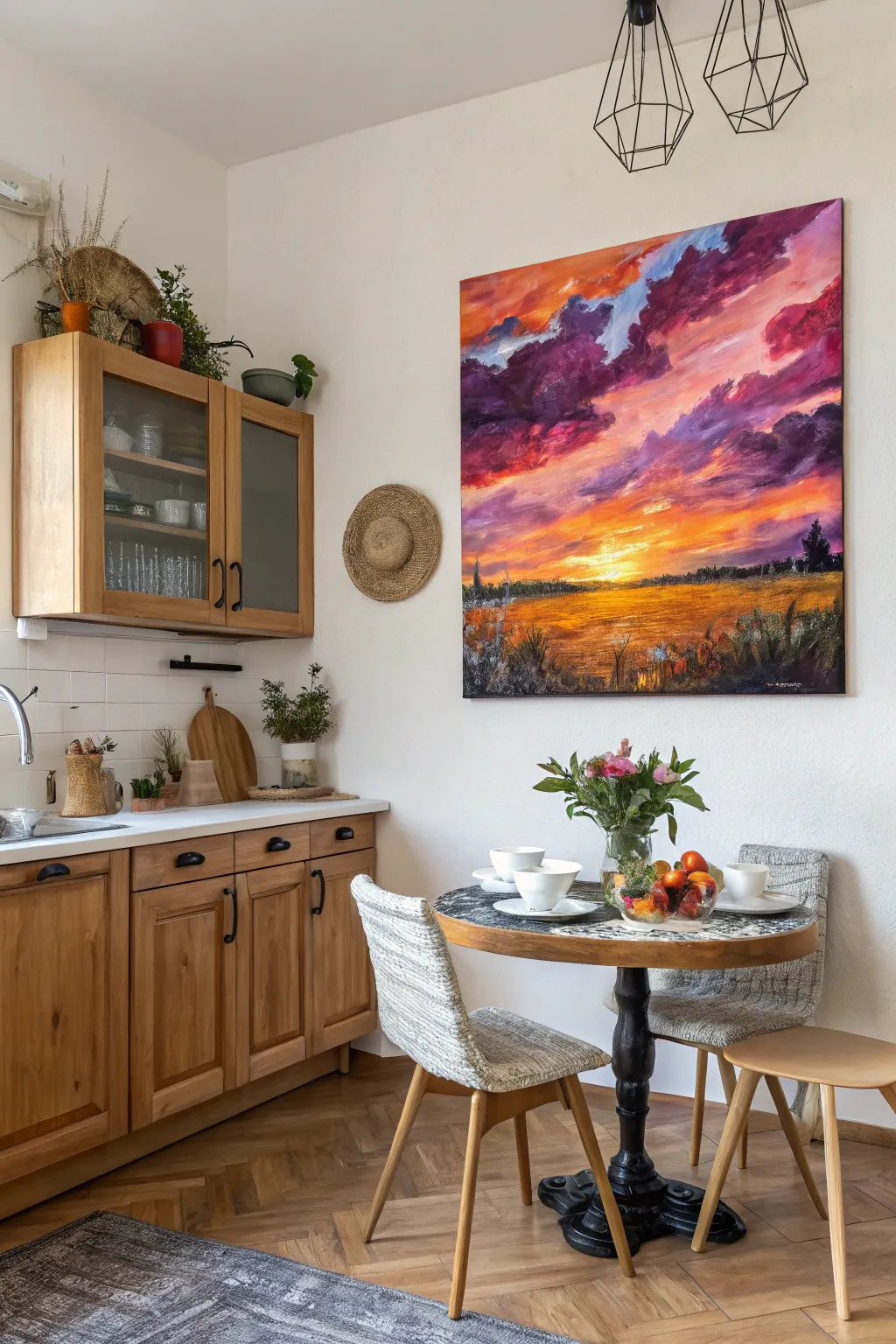 Embody the captivating colors of a sunset in abstract form. I adore how my vibrant sunset artwork brings warmth and vibrancy to our kitchen.