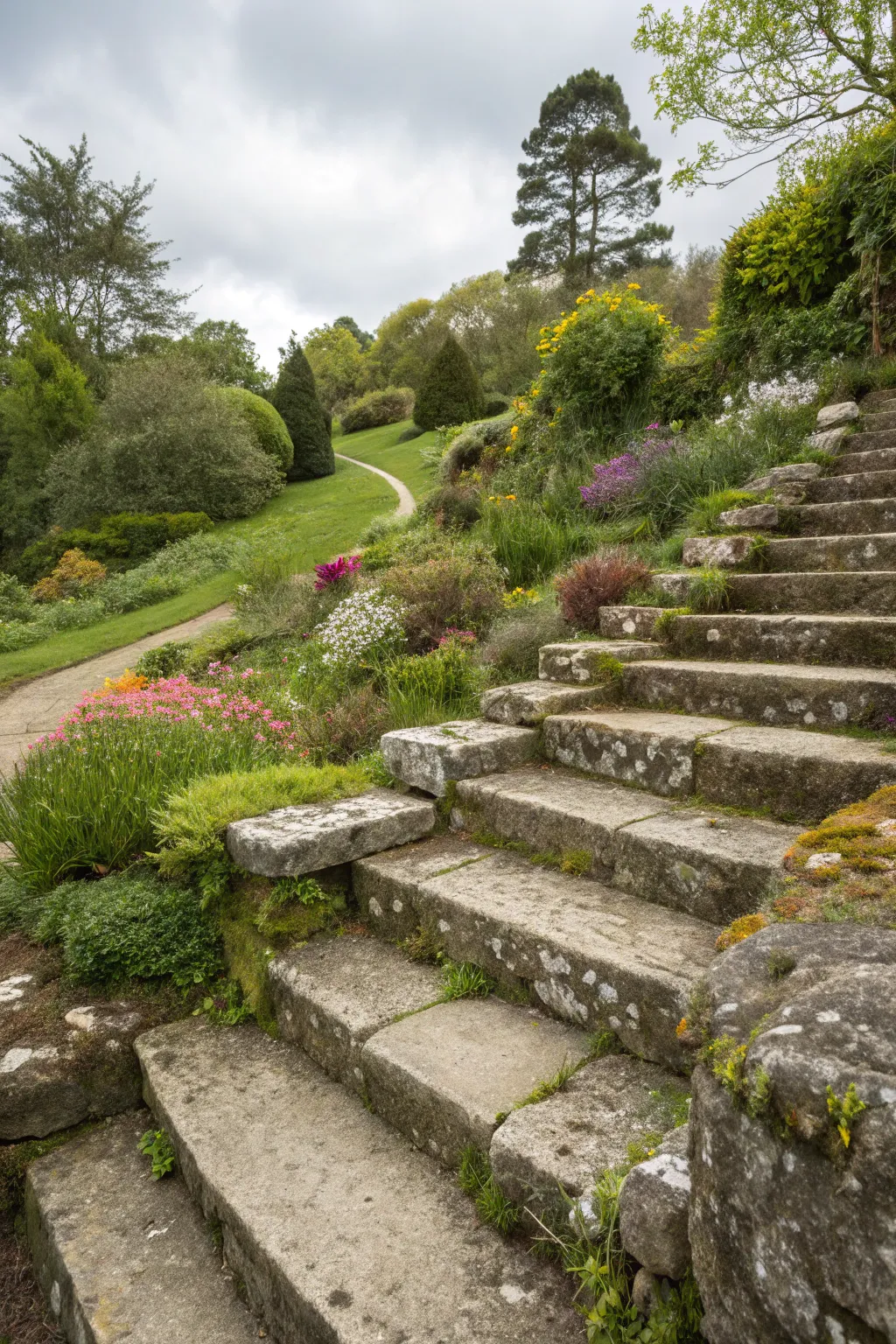 Stone stairs can beautifully deal with a garden on a slant. I’ve gone with big flat stones to craft stairs that flow right into the landscape, turning uphill walks into a treat.