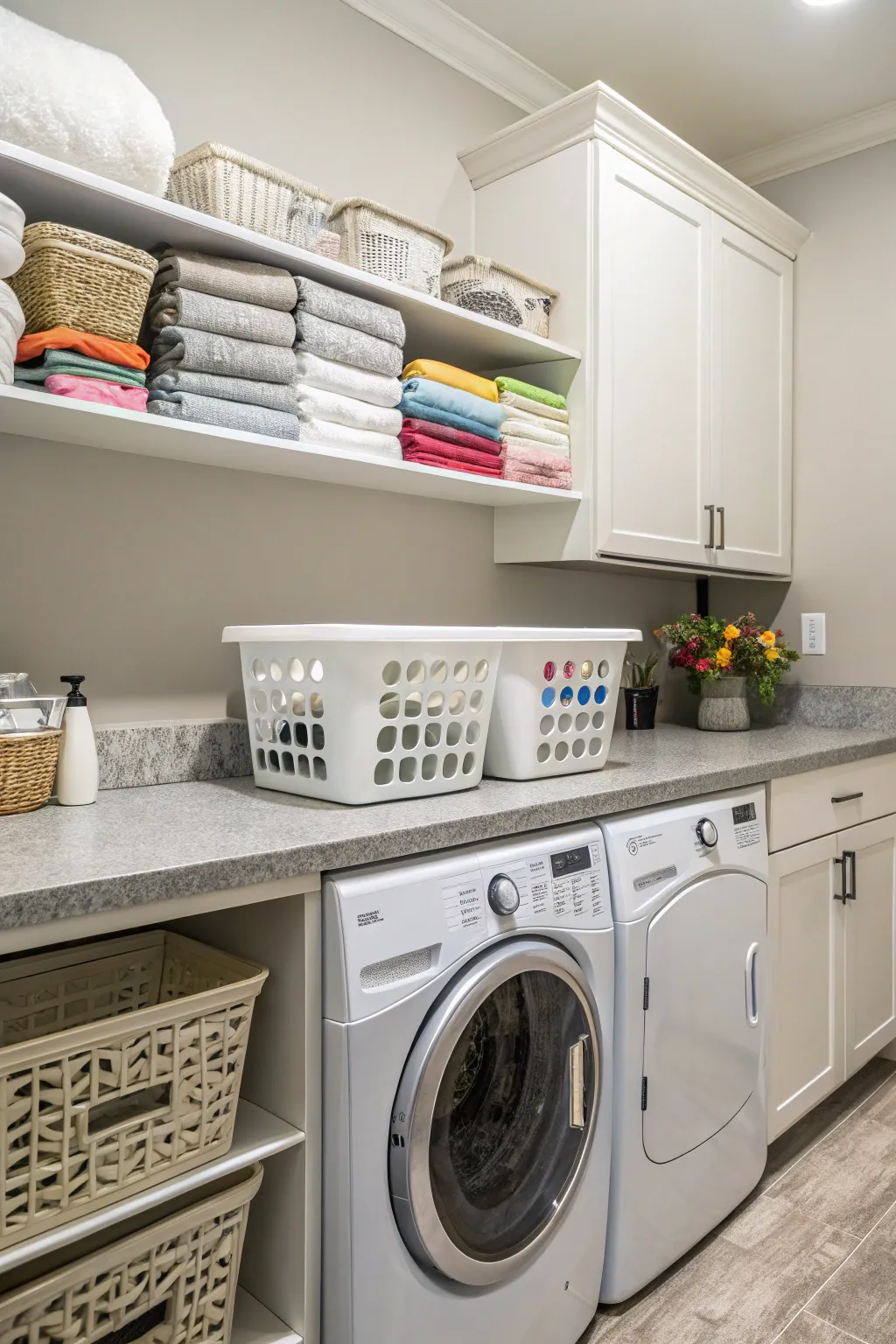 I frequently suggest putting a countertop over your washer and dryer since it gives you a great place to fold clothes and arrange laundry chores.