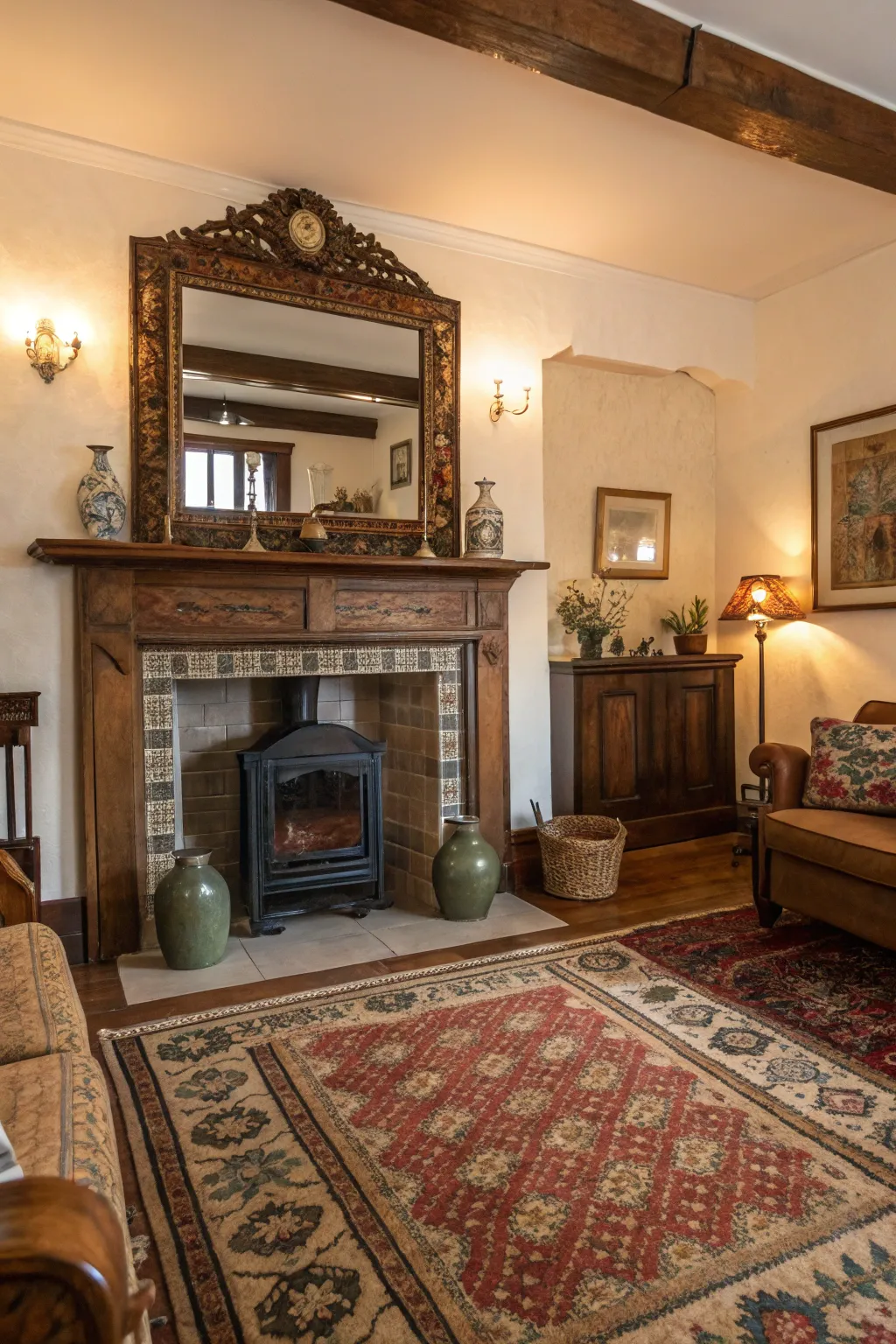 An antique mirror can introduce a sense of history and agelessness above the fireplace. I often employ this to evoke nostalgia and comfort in a room.