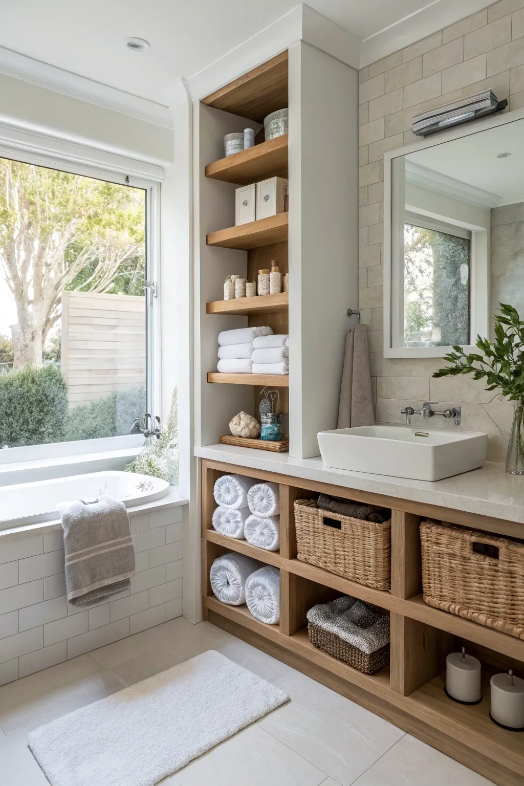 Use understated storage to keep your bathroom uncluttered. I find hidden cabinets and recessed shelving make organization simple.