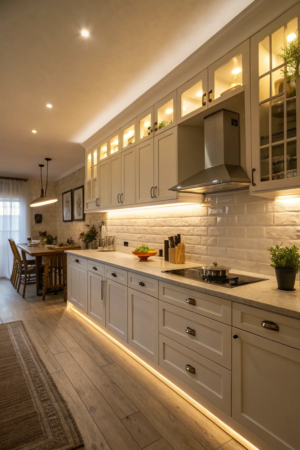 Install LED backlighting in your cabinets to highlight colors and textures. This not only adds warmth but also creates a cozy ambiance.