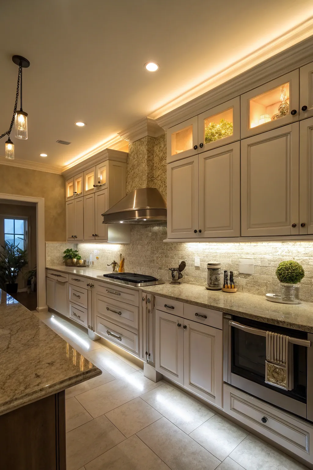 Pair faux crown molding with under-cabinet lights for a glowing kitchen vibe. I love how it adds both style and function in my kitchen.
