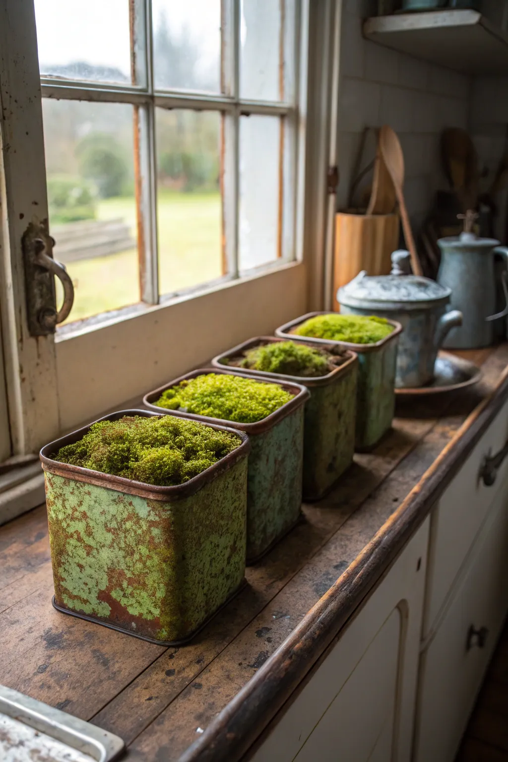 Transform classic metal containers into charming moss arrangements, evoking a nostalgic atmosphere. This concept harmonizes vintage charm with the lush texture of moss, rendering it a delightful accent for any display.