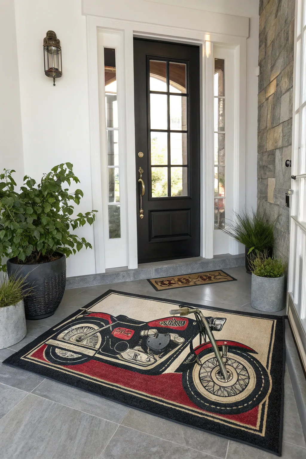 Consider a custom rug with a bike design for your entryway. I put one in my hallway, and it sets the tone for the entire home.
