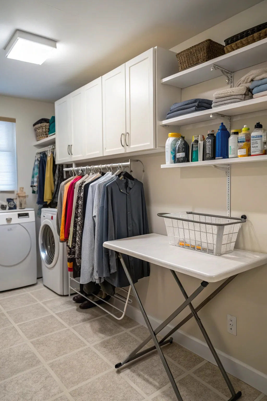 Integrating a wall-mounted rack in your laundry room can streamline the clothes-drying process. It’s an efficient method to maintain order and minimize clutter.