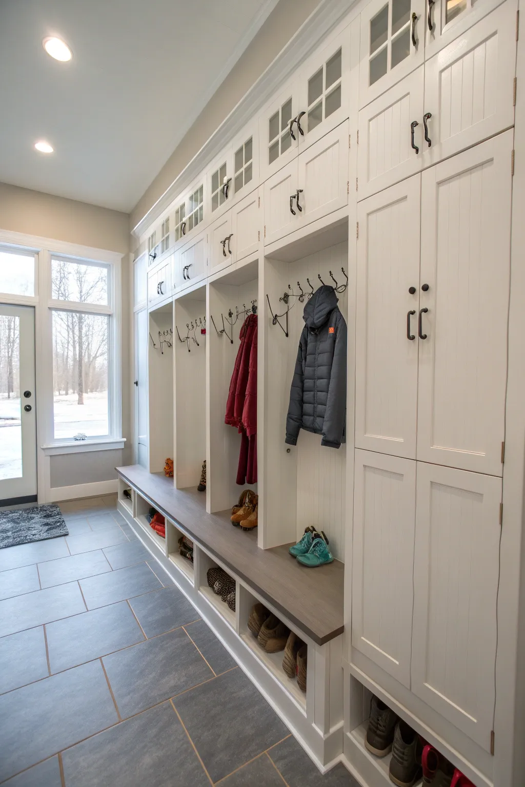 - High Holding Cabinets: Maximize your holding space with a high cabinet, keeping your mudroom neat and organized.