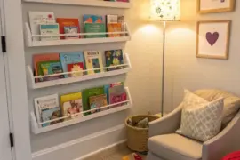 - Wood Bookshelf Attached to the Wall: Organize your baby’s room beautifully with this space-saving wood bookshelf attached to the wall.