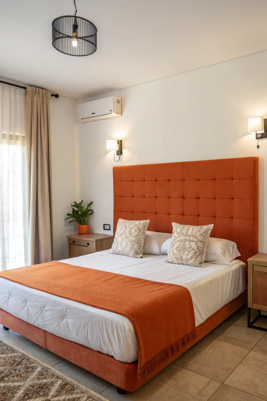 - Zesty Fabric Panel Headboard: Infuse warmth and refinement into your room instantly using a chic orange panel headboard.