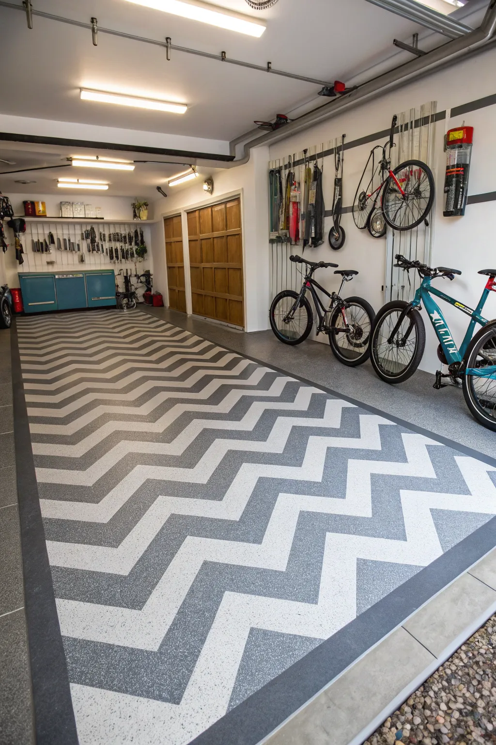 Select a decorative floor design to bring visual interest and make your garage unique. Patterns such as chevron or geometric designs can significantly enhance its visual appeal.